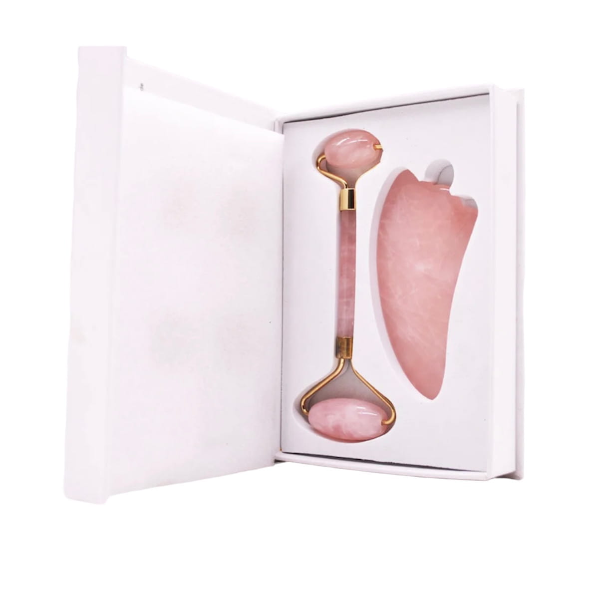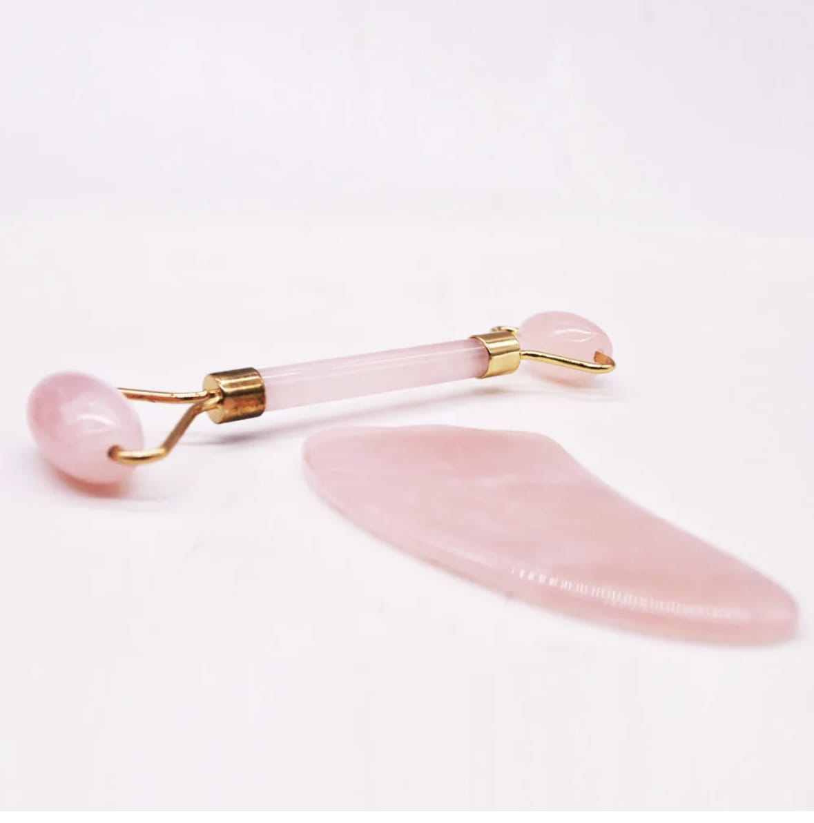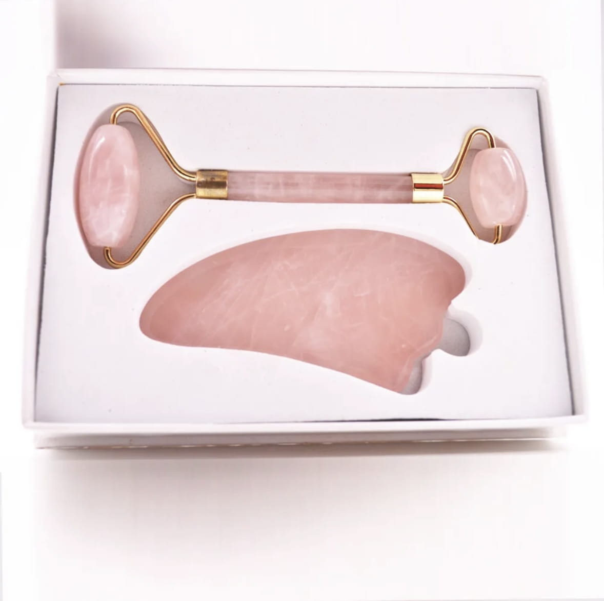 Zestaw GUA SHA różowy kwarc roller i muszelka do masażu ciała i twarzy