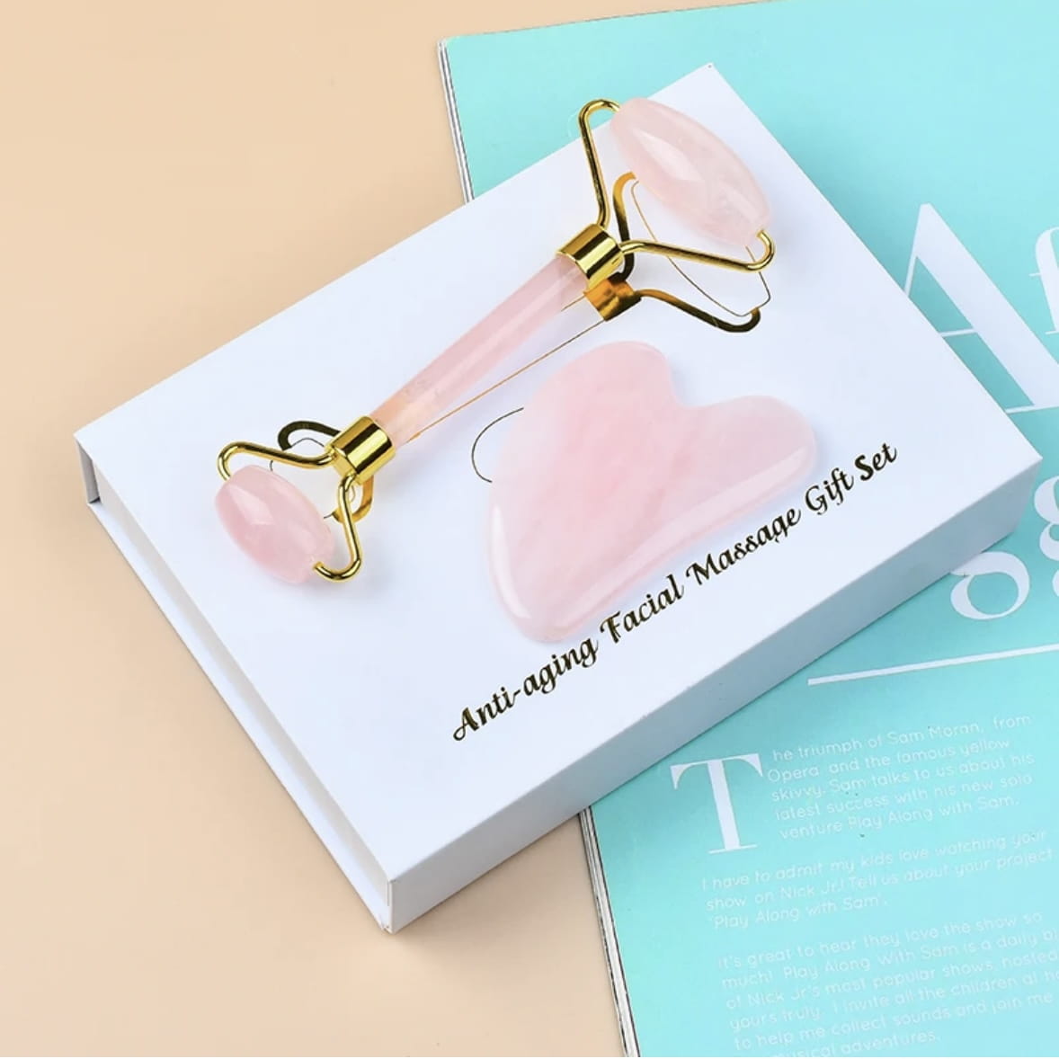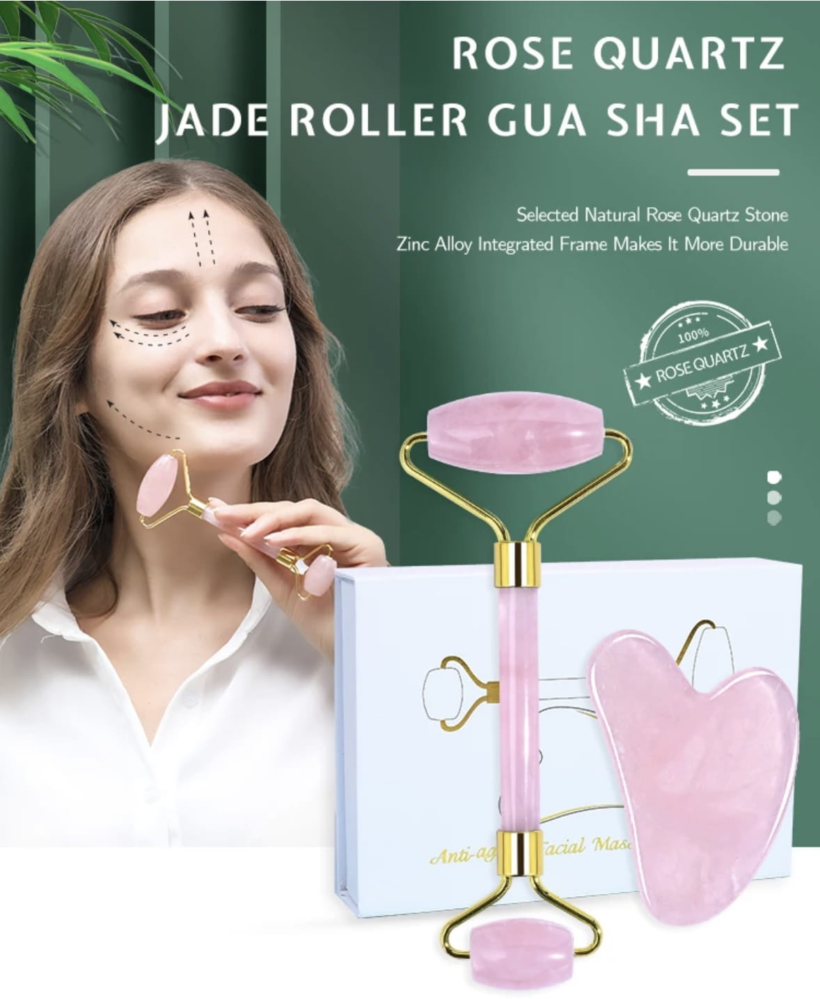 Zestaw GUA SHA różowy kwarc roller i serce