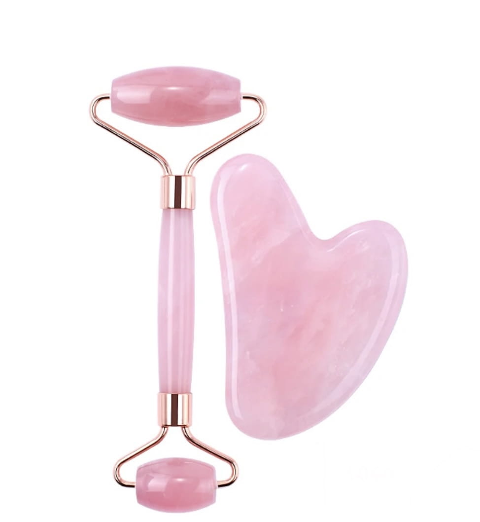Zestaw GUA SHA różowy kwarc roller i serce do masażu ciała i twarzy