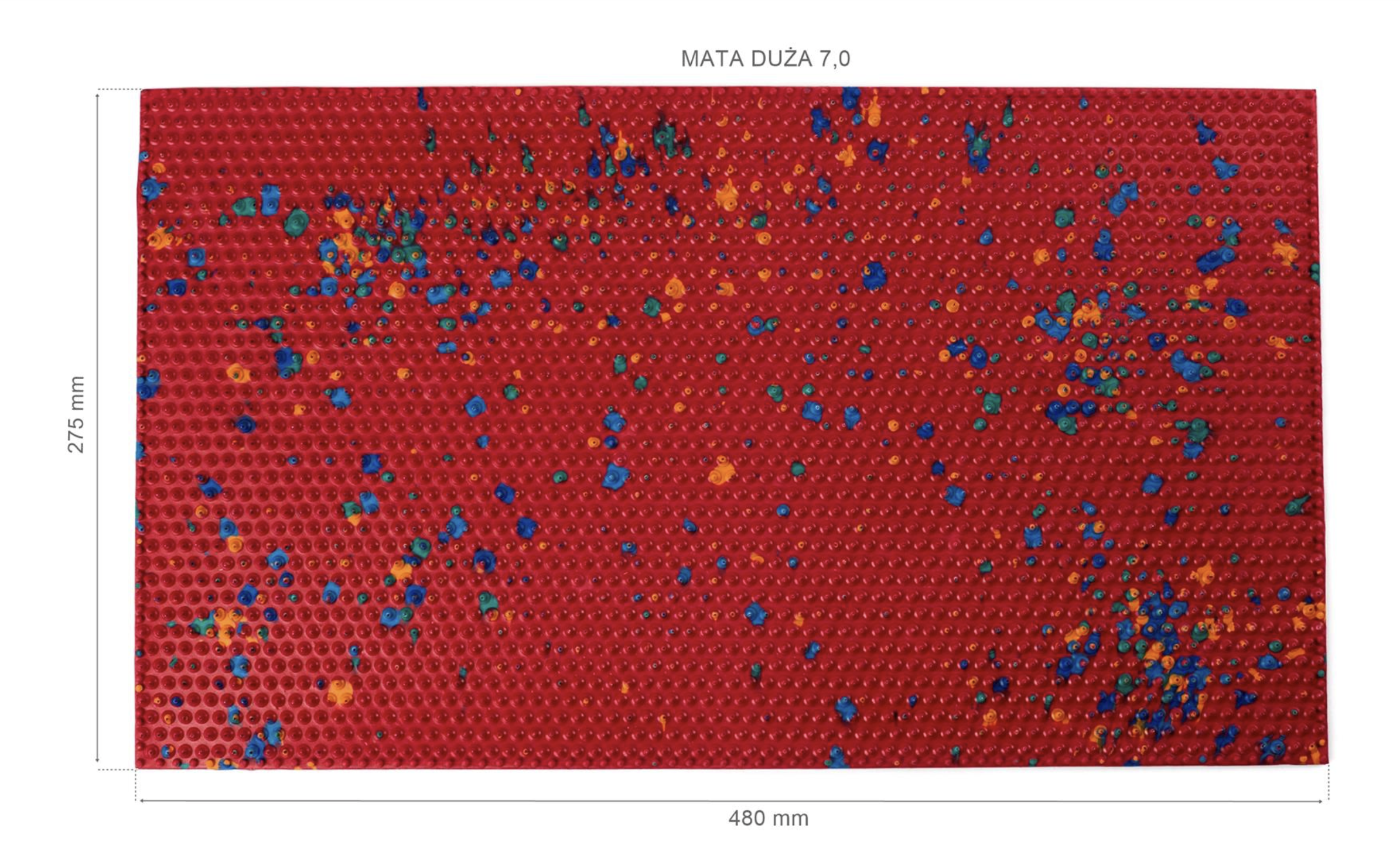Aplikator wieloigłowy Lyapko „Mata Duża” 7,0 przeznaczona jest do zabiegów na dużych powierzchniach ciała –plecach lub brzuchu. Zabiegi wykonywane z wykorzystaniem tak dużej maty są zabiegami kompleksowymi. Charakteryzuje je bardzo wysoka efektywność w terapii chorób oraz uszkodzeń aparatu ruchowego. Przy pomocy Maty 7,0 możemy wykonywać zabiegi w przypadku występowania objawów rwy (kulszowej, barkowej, udowej), dyskopatii, wypuklin i przepuklin krążka międzykręgowego, zmian zwyrodnieniowych, stanów pourazowych, mięśniobóli, skrzywień kręgosłupa i wiele innych schorzeń. Matę 7,0 Lyapko można też stosować jako dywanik pod nogi. W pozycji siedzącej możemy wykonywać zabiegi refleksologiczne na stopy. Tego typu zabiegi wpływają na poprawę funkcjonowanie narządów i układów wewnętrznych oraz świetnie pobudzają krążenie krwi. "Mata duża" 7,0 idealnie sprawdza się w profilaktyce i w kompleksowej terapii chorób układu trawienia – przy zaparciach, kolce, dyskinezie dróg żółciowych czy otyłości. W takim przypadkach możemy kłaść się brzuchem na macie lub układać ją na brzuchu w pozycji leżenia na plecach. Istotnym jest bym podczas zabiegu poprawnie ułożyć się na macie. Dzięki czemu niewygodne odczucia pierwszych kilku minut przechodzą w odczucia przyjemnego ciepła. Możemy odczuwać wibracje lub pulsowanie. A sam zabieg często kończy się pełnowartościowym zdrowym snem. W celu poprawnego ułożenia się na aplikatorze, zalecane jest aby w miejscach gdzie występują zgięcia kręgosłupa (odcinek szyjny i lędźwiowy) pod matę ułożyć zwinięty w rolkę ręcznik frotowy lub niedużą poduszeczkę. W przypadku wstąpienia dyskomfortu odczuwalnego 10-15 minut matę należy użyć dopiero w dniu następnym. Przyczynami odczuć dyskomfortu mogą być: nieprawidłowe ułożenie aplikatora, tzn. nierównomierność obciążenia na igły.Czas zabiegu (leżenia na aplikatorze Lyapko), ma ścisły związek z otrzymaniem pożądanego efektu terapeutycznego: