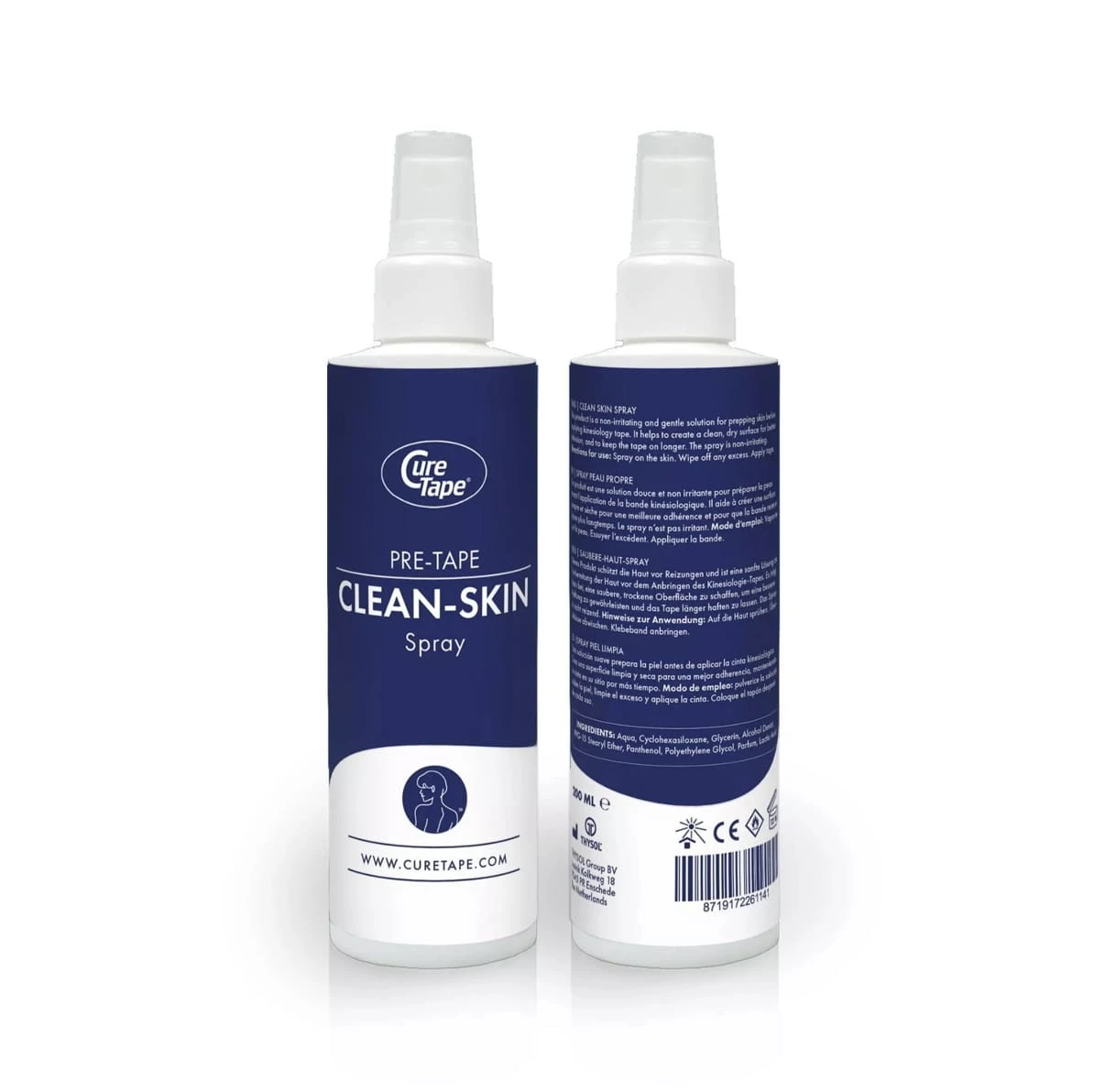 CureTape Pre-Taping Clean Skin to specjalistyczny spray dezynfekujący i oczyszczający skórę, stosowany przed naklejeniem taśm do kinesiotapingu. Zawiera 70% alkoholu, dzięki czemu skutecznie usuwa pot, sebum, pozostałości kosmetyków oraz wszelkie zanieczyszczenia, które mogą osłabiać klej plastra.
