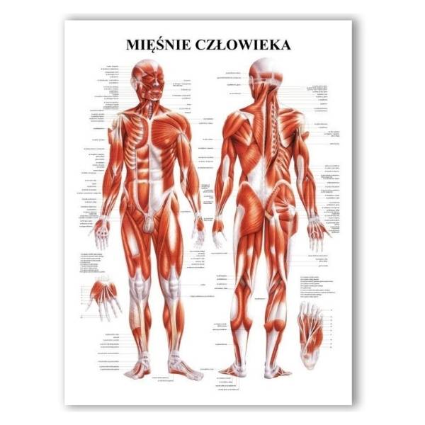 - Plakat jest szczegółowy i zgodny z prawidłową anatomią człowieka. Zawiera drobiazgowy układ mięśniowy człowieka, a także zaznaczone kości oraz chrząstki.