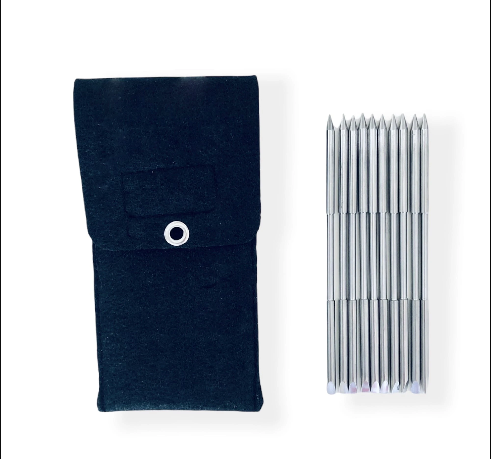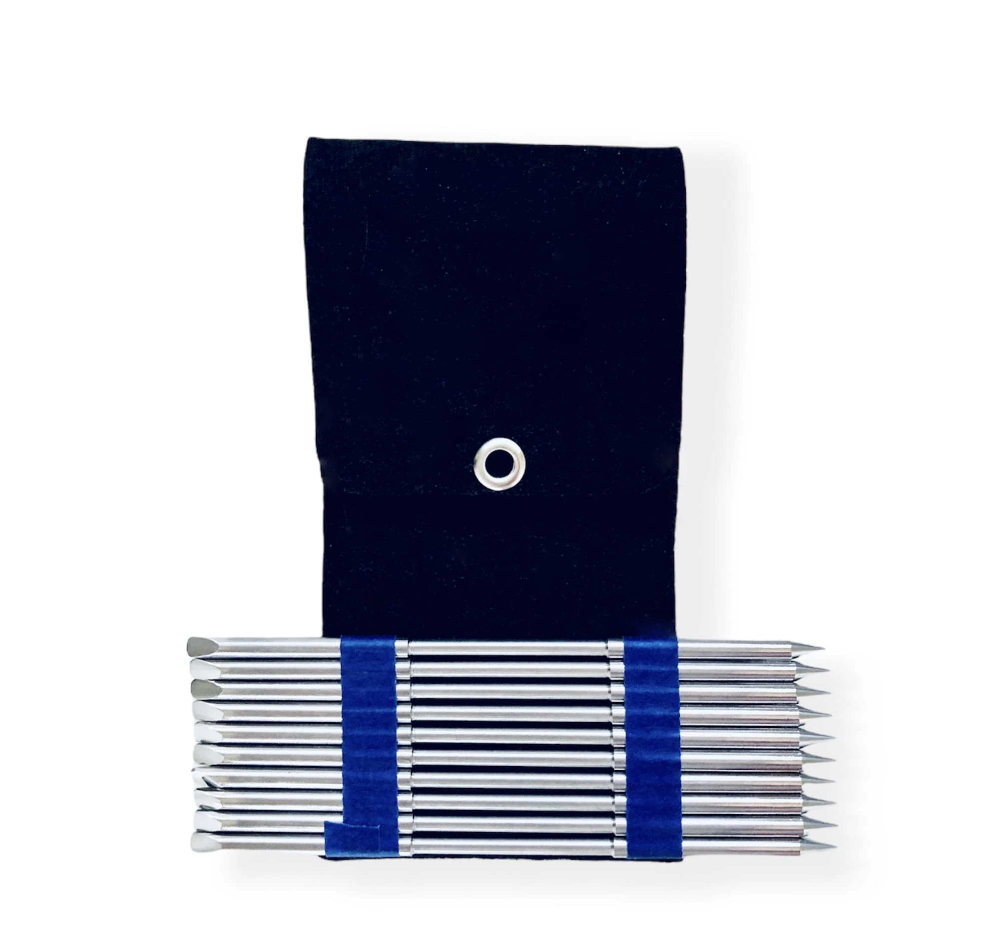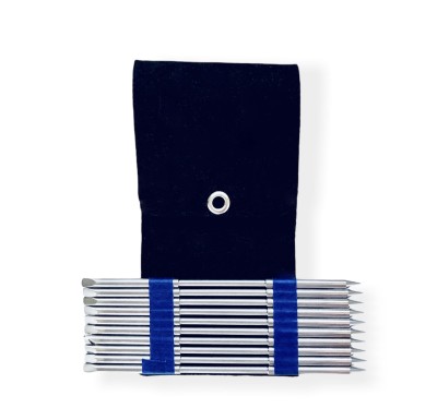 W zestawie znajduje się 10 klawików o długości ok. 12 cm oraz eleganckie etui z czarnego filcu, które chroni narzędzia przed zarysowaniami i ułatwia ich przechowywanie oraz transport.