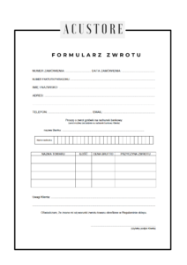 Klient ma prawo odstąpić od umowy sprzedaży produktów zakupionych w sklepie internetowym ACUSTORE w ciągu 14 dni od ich otrzymania na zasadach opisanych w Ustawie z dn. 30.05.2014 r. o prawach konsumenta ( Dz. U. z 2014 nr 827).